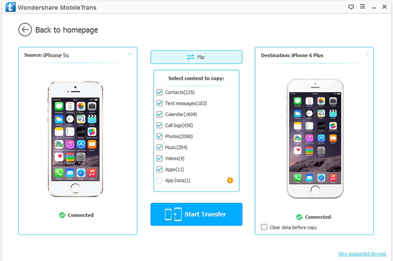 Afer then,you should connect your iPhone 5 and iPhone 7 or iPhone 7 Plus to your computer throughing USB lines.For this step I want to remind you that,you should sure your iPhone 5 as a source smartphone should display on the left of the computer,the iPhone 7 or iPhone 7 Plus as a destination should display on the right of the computer,otherwise, you also can click on "Fill"to exchange their location.